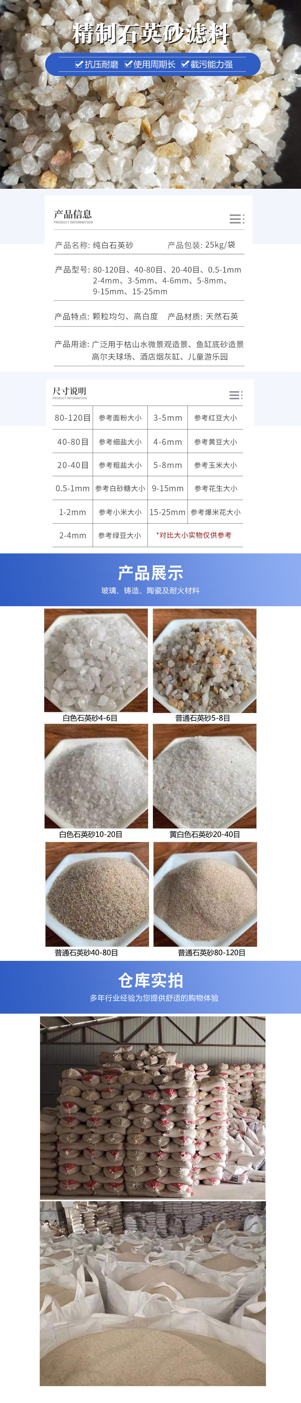 石英砂濾料是我國目前使用及其廣泛的一種濾料。龍華——專業的石英砂濾料生產團隊,水處理用石英砂、濾料用石英砂、過濾用石英砂。 石英砂適用范圍:我公司生產的精制石英砂濾料是采用高純度的石英礦石,經破碎、篩分、水洗加工而成。其作用是與過濾容器結合,用于截留水中懸浮物膠體等顆粒雜質。適用于電力系統、多介質過