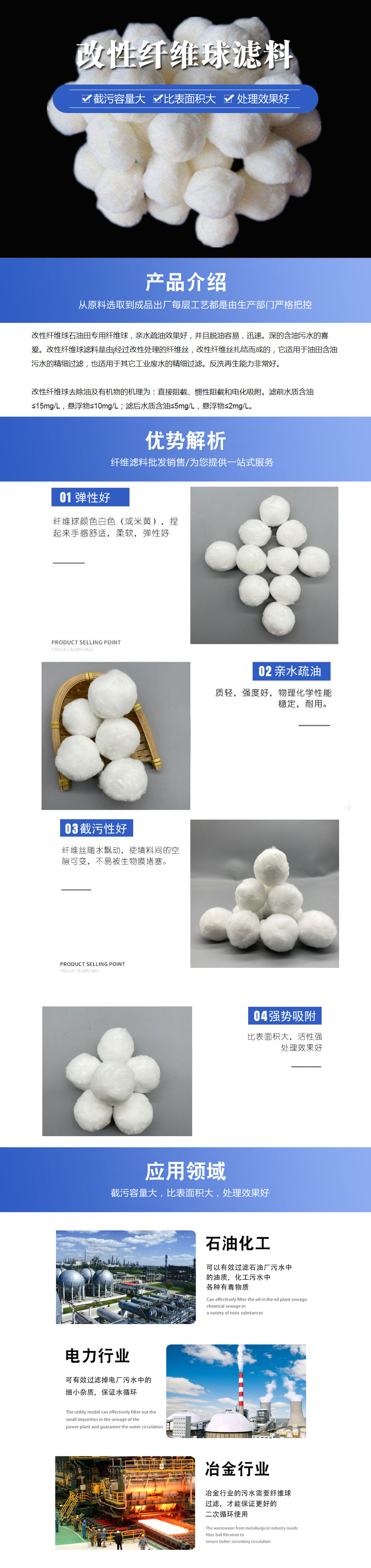 改性纖維球濾料選用優質進口改性纖維絲以扎結而成。原纖維絲經過預熱→蒸汽牽伸→水洗→改性處理→烘干→ 熱定形→卷曲→分絲→扎結→剪斷→包裝等工藝加工而成。改性纖維球濾料單絲直徑可達幾十微米,屬于微米級過濾材料(砂濾器屬于毫米級),纖維絲的直徑為um級,具有強大的比表面積,對水中的顆粒的截留和吸附能力有極