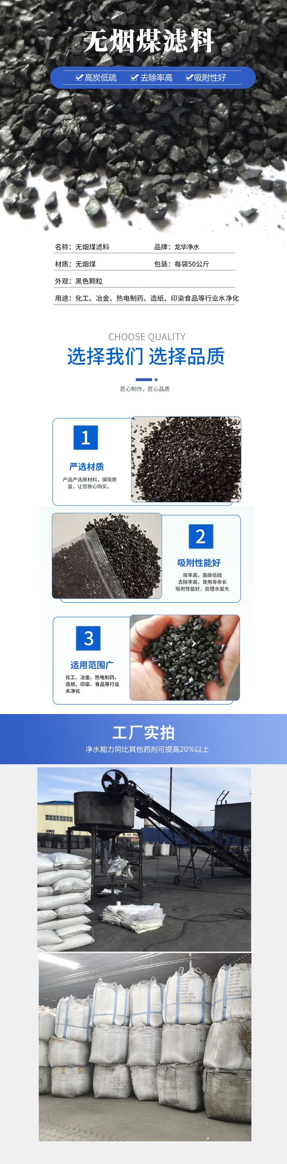 外觀光澤好,呈不規則顆粒狀,機械強度高,抗壓性能好,化學性能穩定,不含有毒物質,不易磨損,在酸性、中性、堿性水中均不溶解,另外無煙煤顆粒表面粗糙,有良好的吸附能力,孔隙率大(>50%),有較高的含污能力,因質輕,所需反沖洗強度較低,可節省大量反沖洗水量及電能。
